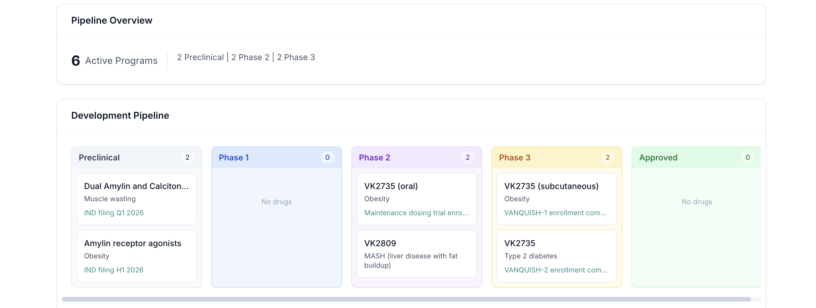Visualize the entire development pipeline at a glance. See which drugs are in preclinical, Phase 1, 2, 3, or approved—with key catalysts and timelines for each.